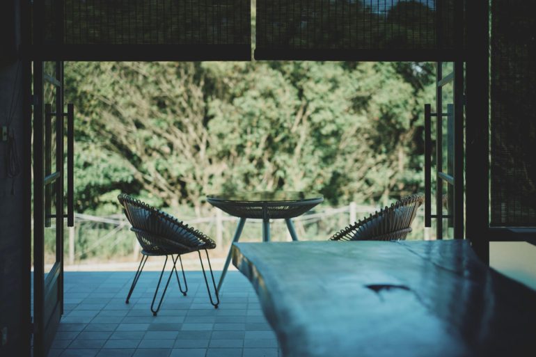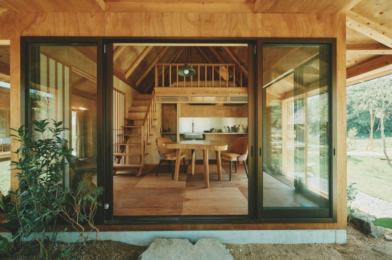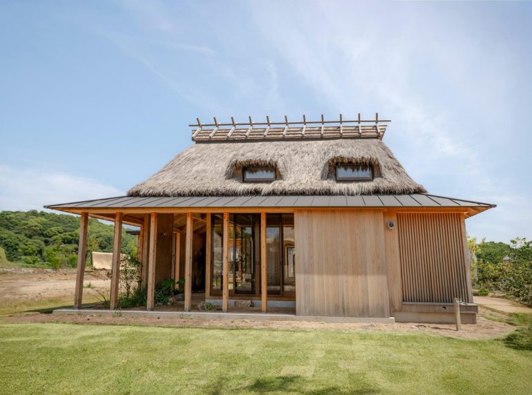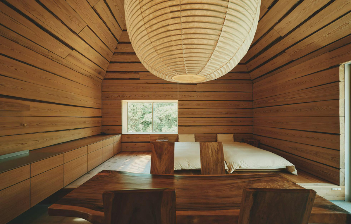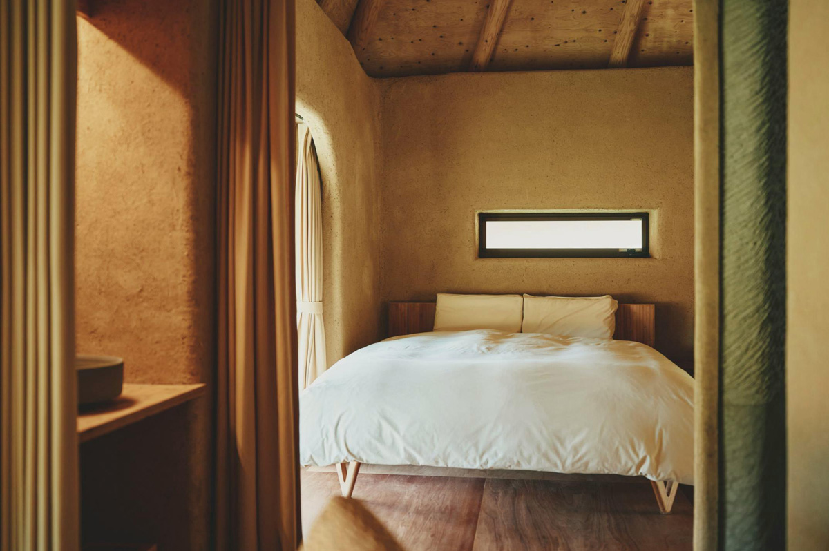 大きな開閉式の扉を開けると、内と外の境界が消え、風や光が自由に流れ込む。稲わらで覆われた屋根は、淡路島の四季と一体となり、目に映る景色と手触りが自然そのものになる。ここでは時間の感覚もゆっくりと流れ、日常を忘れて自然と調和する心地よさを味わえる。