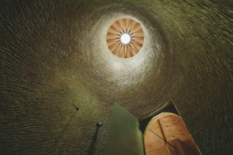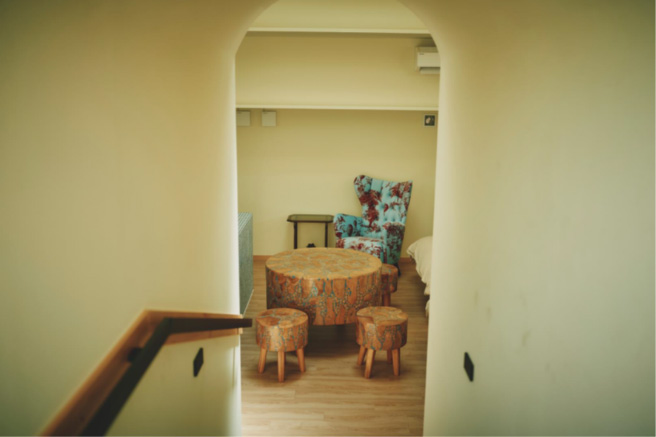 土・竹・藁の自然素材が織りなす温もりある空間は、訪れた瞬間に心をほどく力を持っている。中央にそびえる土の塔が空間をやわらかく仕切り、ひとつひとつの居場所に安らぎを生む。窓から差し込む光と土の香りが、まるで淡路島の自然そのものに抱かれているかのような感覚をもたらす。
