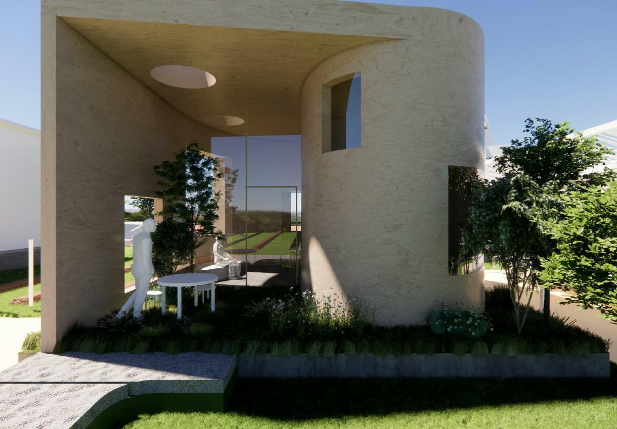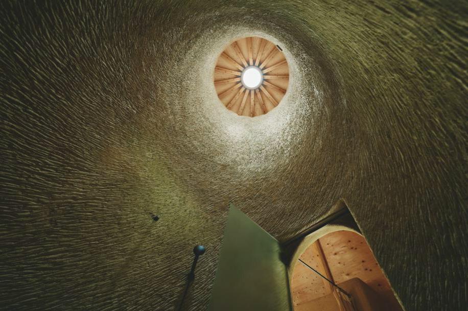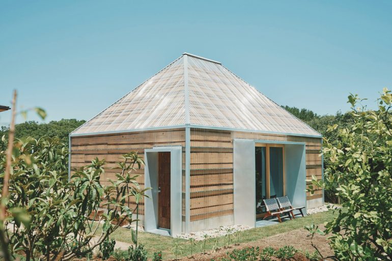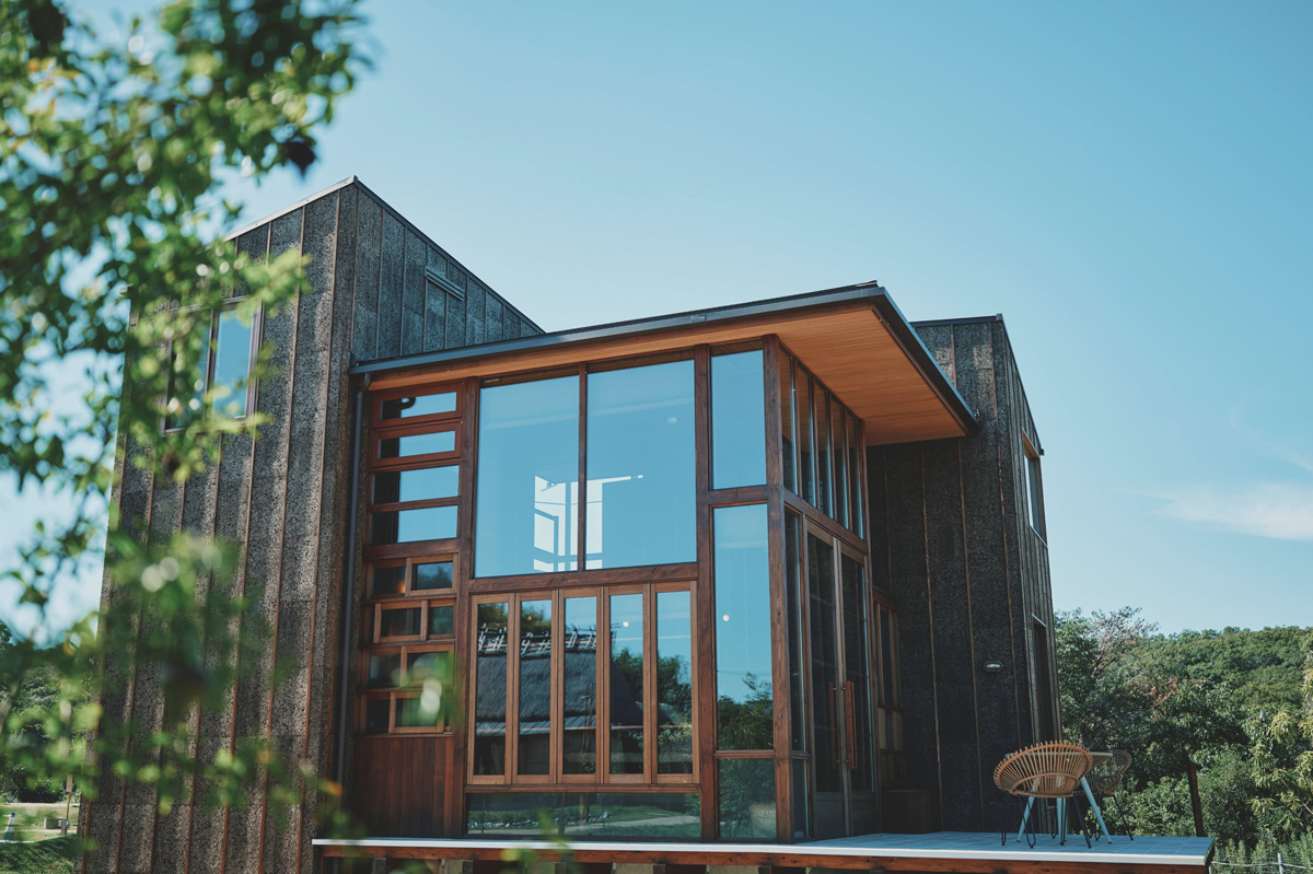積み上げられた窓とコルク素材が織りなす多層的な空間は、自然との対話を可能にする設計だ。光と風が窓を通して立体的に入り込み、畑や庭と呼応する。ここでは、建物と自然の境界が曖昧になり、生活の一部として自然と共生する喜びを体感できる。
