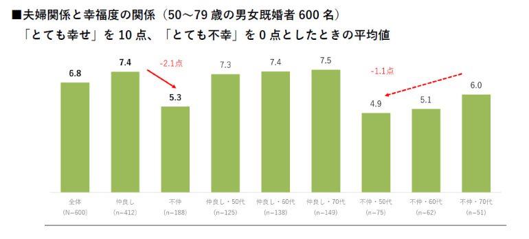 年代別に見ると、仲良し夫婦の幸福度は年代による差がほとんどなかったのに対し、不仲夫婦では年齢が若いほど幸福度が低下する結果となった。