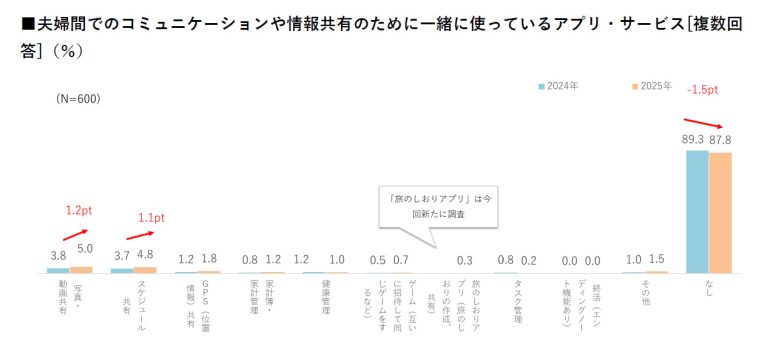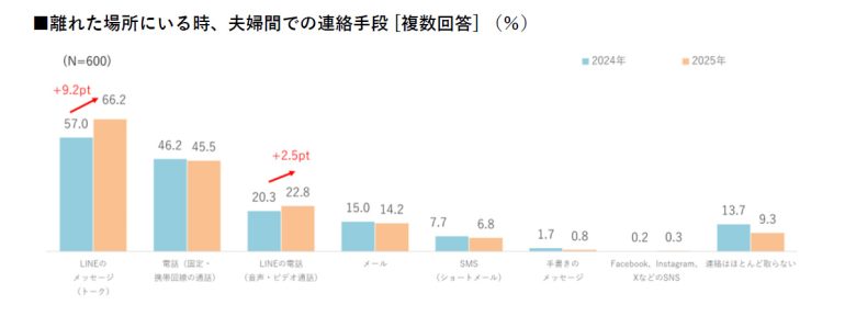 次いで多いのは電話(固定・携帯回線の通話)だが、昨年と比べてほぼ横ばい。LINEの電話は2.5ポイント増加している。夫婦間のコミュニケーションにFacebook、Instagram、XなどのSNSを使う割合は0.3%だった。