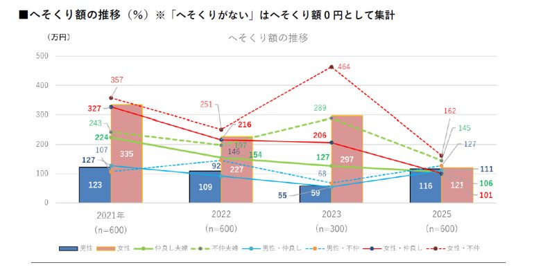 へそくり額の傾向が変化。2023年までは、女性>男性、不仲夫婦>仲良し夫婦の構図が、今回の調査では差が縮小した