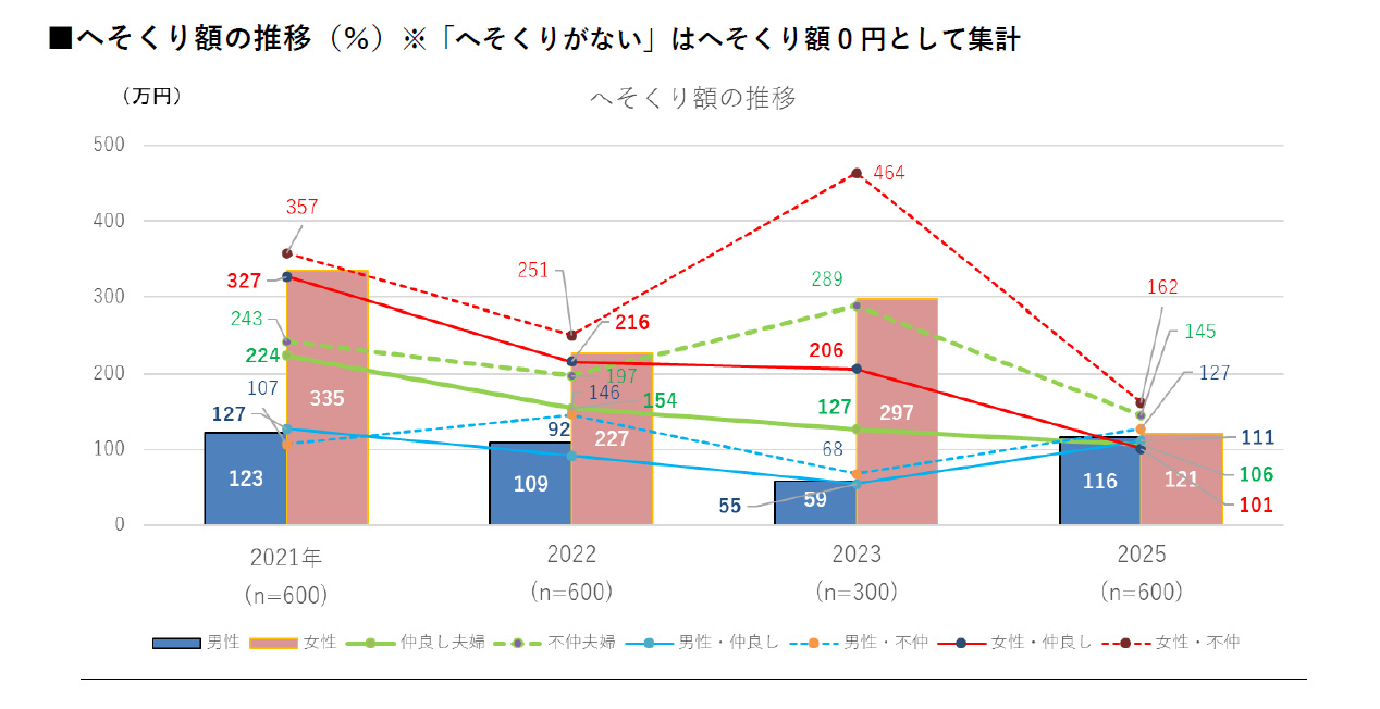 へそくり額の傾向が変化。2023年までは、女性>男性、不仲夫婦>仲良し夫婦の構図が、今回の調査では差が縮小した