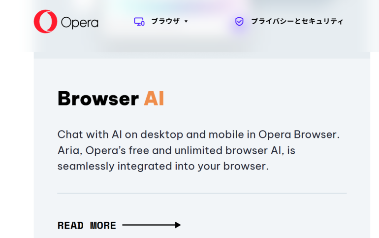 Operaは「Aria」と呼ばれるAIアシスタントを標準搭載し、検索補助・要約生成・コード支援など幅広い機能を提供する。特に、サイドバーからAI機能をすぐに呼び出せる操作性が特徴である。