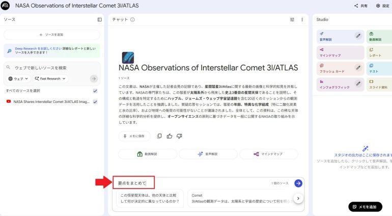 NotebookLMではAIに質問して重要情報を抽出できる。