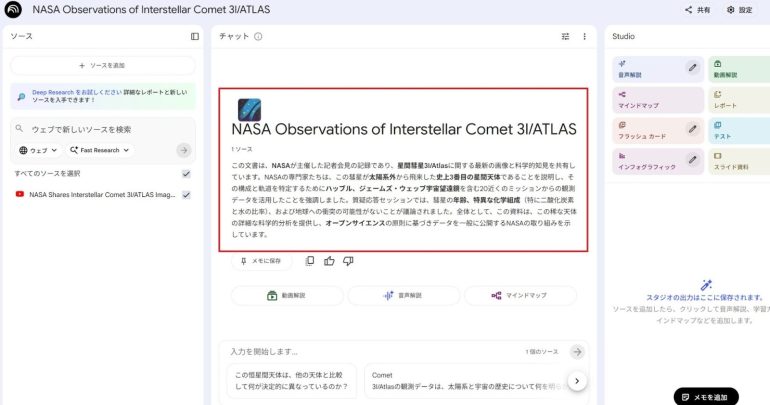 - 複数の資料(動画・PDF・テキスト)を横断的に分析できる