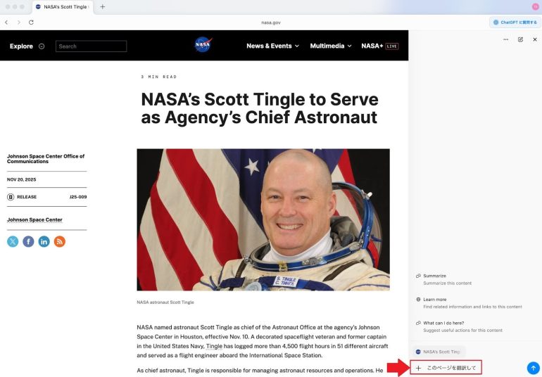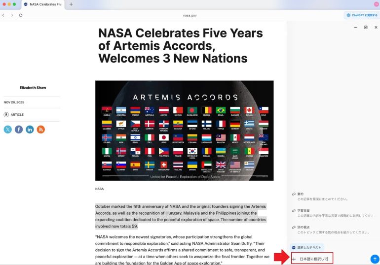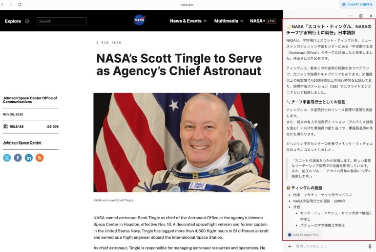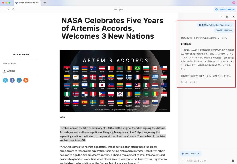 特に、海外製品の仕様書、学術論文、テック系の最新情報などは英文が中心となるため、Atlasの翻訳機能を使うことで、情報収集のスピードが大幅に向上する。