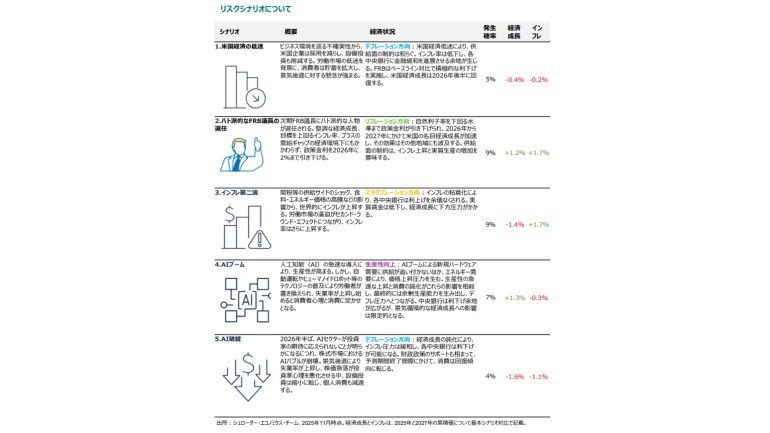 基本シナリオ以外で最も可能性の高いリスクシナリオとして、「ハト派的なFRB議長の選任」 と「インフレ第二波」を想定している。「ハト派的なFRB議長の選任」では、堅調な経済環境にもかかわらずFRBが政策金利を2026年に2%まで引き下げることで、リフレーション圧力がかかることを想定。