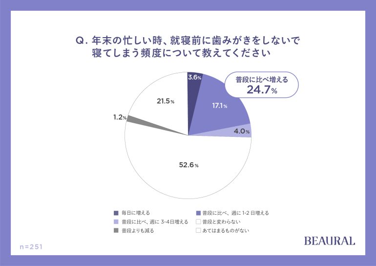 「年末に忙しくなる」という人を対象に「年末の忙しい時、就寝前に歯みがきをしないで寝てしまう頻度について教えてください」と質問したところ、24.7%が「普段に比べ増える」と回答した。