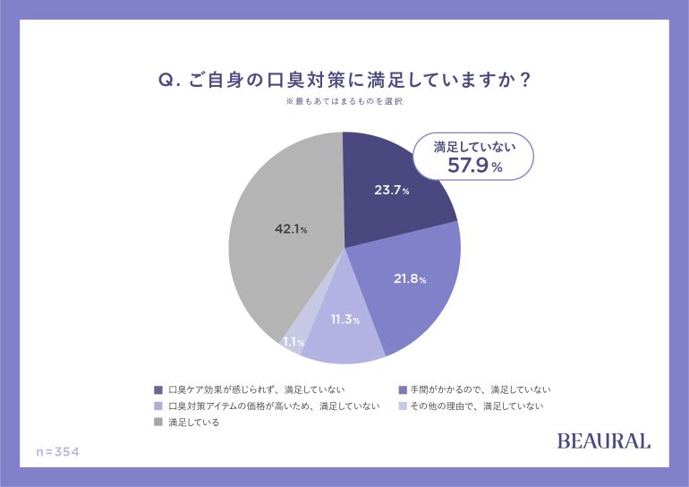 「飲酒やストレスにより口臭が気になる時、口臭対策を行っている」という人を対象に「ご自身の口臭対策に満足していますか?」と質問したところ、「満足していない」が57.9%にのぼった。そのうち「口臭ケア効果が感じられず、満足していない」が23.7%、「手間がかかるので、満足していない」が21.8%となった。