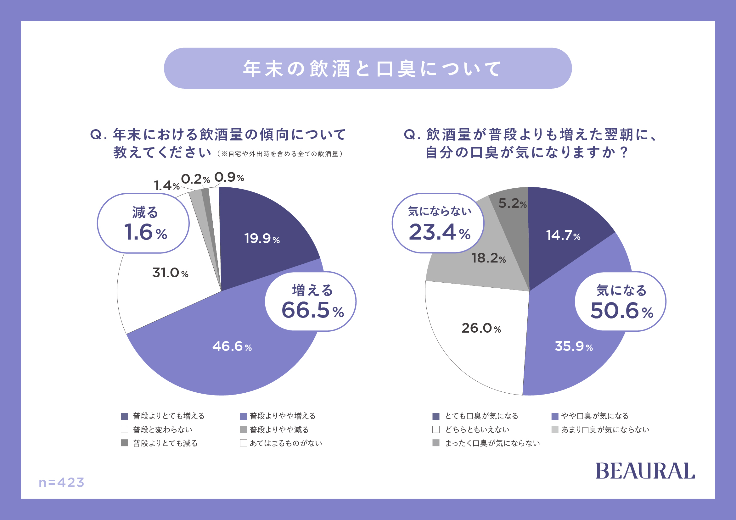 「年末における飲酒量の傾向について教えてください※自宅や外出時を含める全ての飲酒量」という質問に対して、66.5%が「増える」と回答した。さらに、「飲酒量が普段よりも増えた翌朝に、自分の口臭が気になりますか?」と質問したところ、50.6%が「気になる」と回答した。