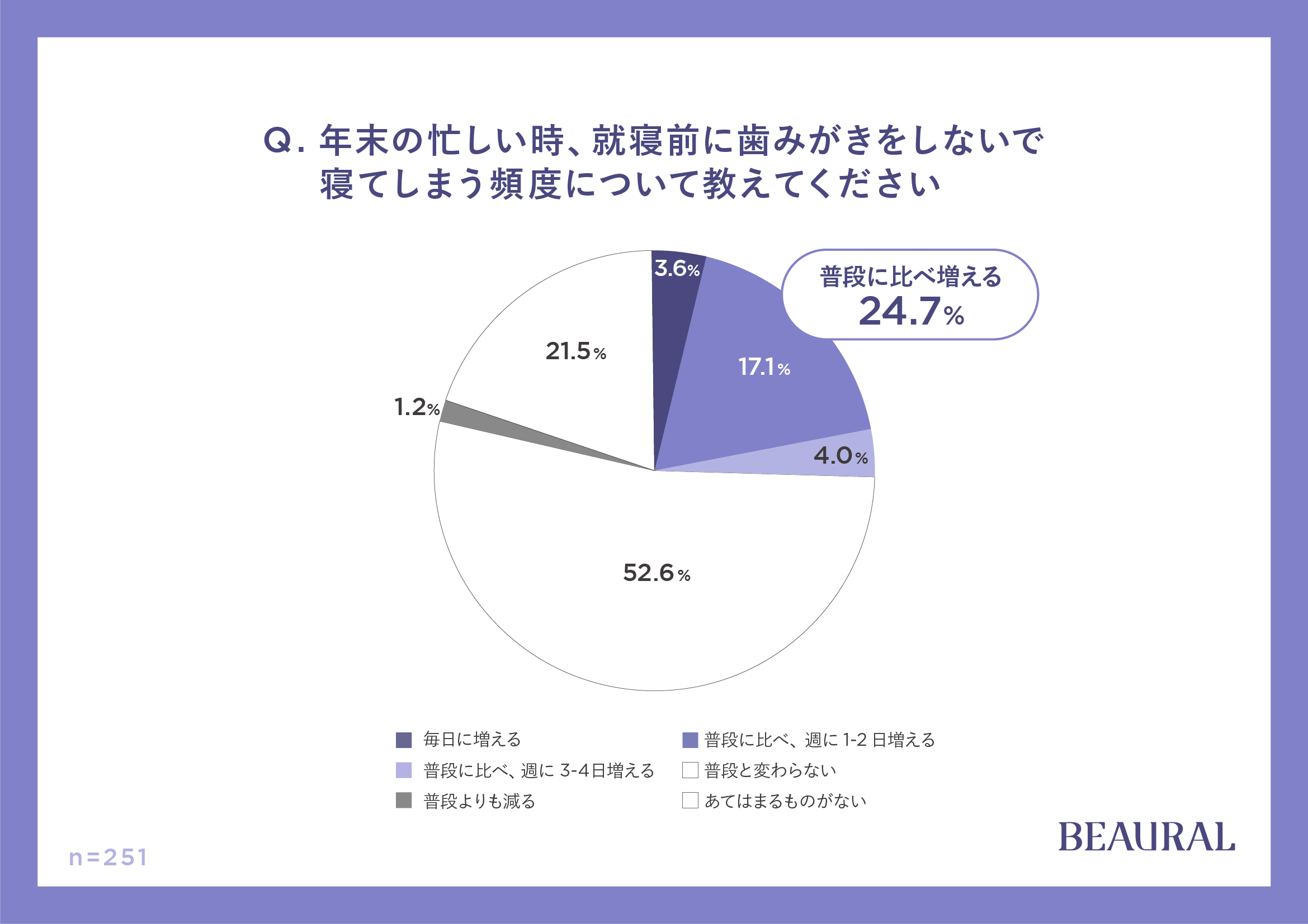 「年末に忙しくなる」という人を対象に「年末の忙しい時、就寝前に歯みがきをしないで寝てしまう頻度について教えてください」と質問したところ、24.7%が「普段に比べ増える」と回答した。