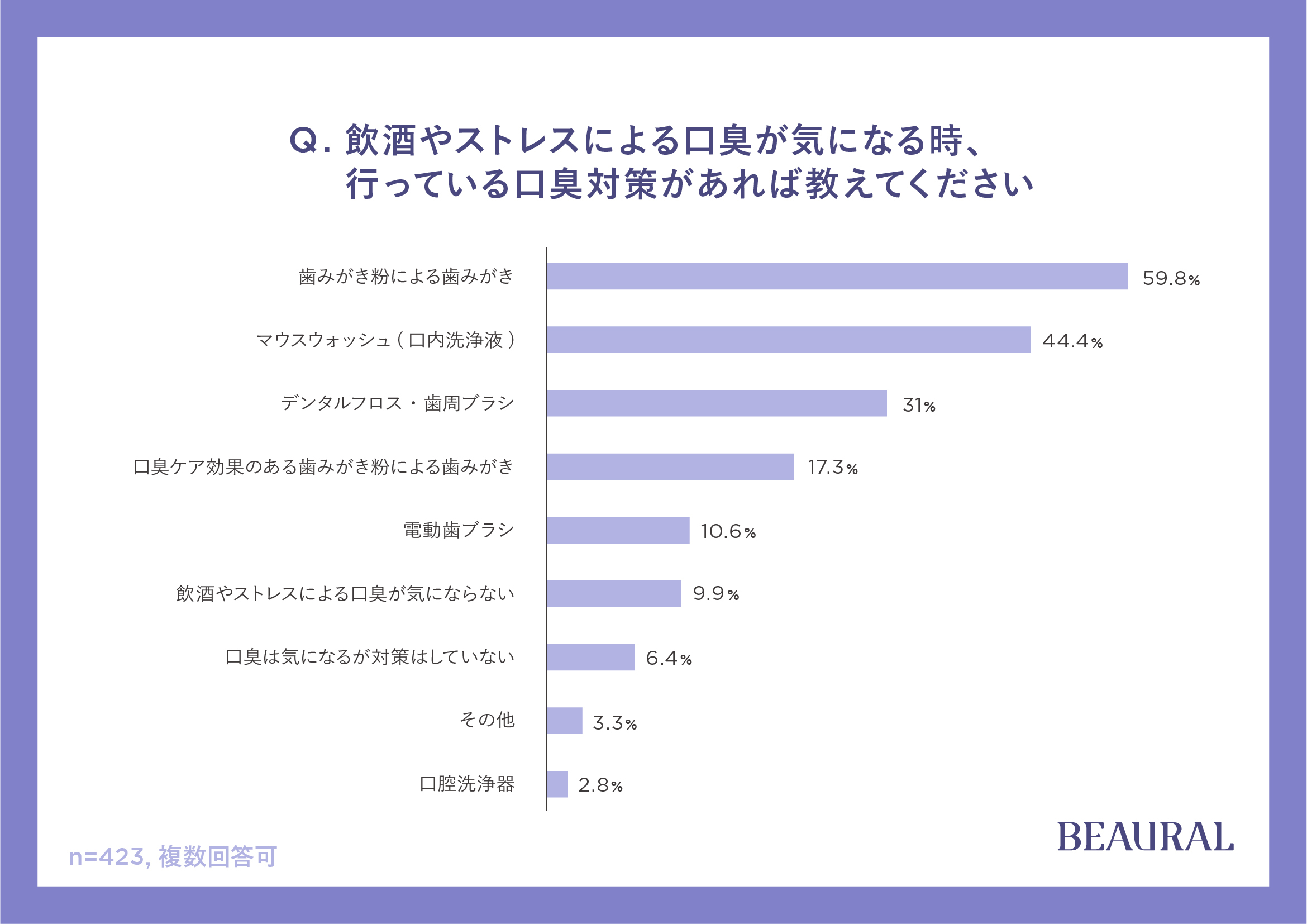 「飲酒やストレスによる口臭が気になる時、行っている口臭対策があれば教えてください」と質問したところ、上位の回答は「歯みがき粉による歯みがき」が59.8%、「マウスウォッシュ(口内洗浄液)」が44.4%、「デンタルフロス・歯間ブラシ」が31%で、多くが定番アイテムを使用する傾向にあると言える。また、「口臭は気になるが対策はしていない」という回答がわずか6.4%から、口臭対策への意識は全体的には高いことがわかった。