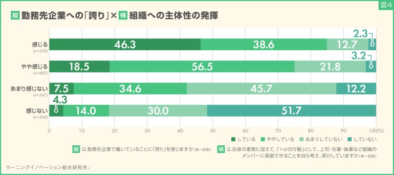 勤務先企業で働くことへの誇りを「やや感じる」「あまり感じない」の結果も鑑みると、勤務先企業で働くことへの「誇り」と、組織への「主体性の発揮」には、相関の関係があることがわかった(図4)。