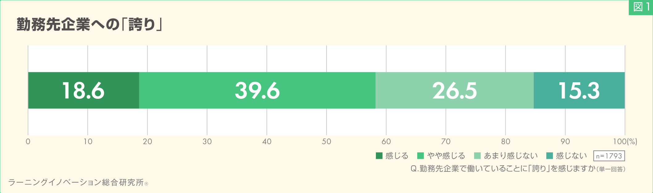 はじめに、社会人1~4年目の若手社員に対して、勤務先企業で働いていることに「誇り」を感じるか質問した。結果、「感じる」と回答した割合は18.6%、「やや感じる」と回答した割合は39.6%となり、58.2%の若手社員が勤務先企業に「誇り」を感じていることがわかった(図1)。