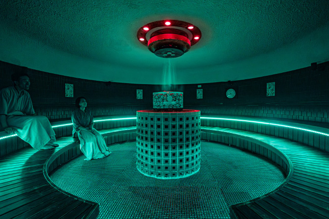 男性・女性で趣向の異なるサウナが楽しめるほか、屋外バーデゾーンには男女水着で入れるサウナストーブ5基が並ぶ本格サウナや、貸切テントサウナを設置。サウナデートにも人気の施設だ。