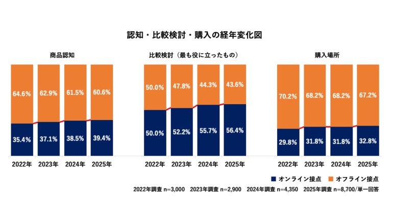 2022年の調査開始以降、継続的な変化として、購買プロセス(認知・比較検討・購入)の各フェーズにおいてデジタル接点の活用は引き続き増加している。