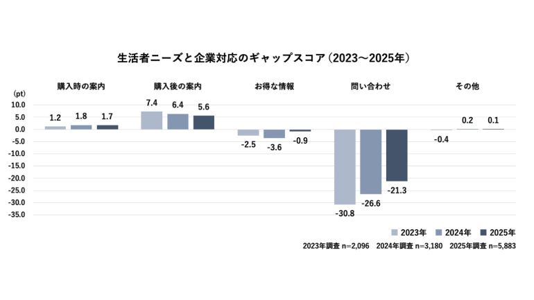 2023年から2025年にかけて、生活者の「問い合わせ対応」に関するニーズと実際の企業対応とのギャップは徐々に縮小しているものの、ギャップスコアは、2023年は-30.8pt、2024年は-26.6pt、2025年は-21.3ptと、他の項目と比較して依然として高い水準にある。この結果から、企業のサポート体制の強化が引き続き求められていることがわかる。