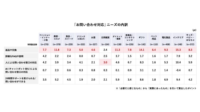 また、「問い合わせ対応」項目の分析の結果、13カテゴリー中12カテゴリーにおいて、「返品・交換」に関するニーズが最も多く寄せられていることが明らかになった。(図3)