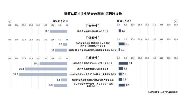 生活者の購買行動においては、昨年に引き続き、安全性や信頼性を重視する傾向が継続して見られた。また、今年はクーポンやポイントなどの経済的メリットを積極的に活用する動きが強まっており、安心・安全と経済性の両面から購買リスクを軽減しようとする「リスクヘッジ購買」の傾向が一層顕著になっている。(図4)