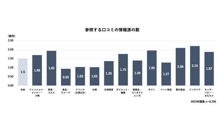 特に2025年は、口コミに関するデータを新たに取得したことで、生活者が複数の情報源で口コミを確認する傾向が明らかになった。生活者は、平均1.5か所でレビューや口コミを参照し、高価格帯が含まれる家電やインテリアに関しては、平均2か所以上のレビューや口コミを参照している結果が出ている。これは、購入に対して慎重な姿勢を示しており、「失敗したくない」「後悔したくない」といった心理が背景にあると考えられる。口コミの確認行動が加わることで、生活者の情報収集はより多面的かつ精緻になり、リスクヘッジ購買の傾向をさらに強める要因となっている。(図5)