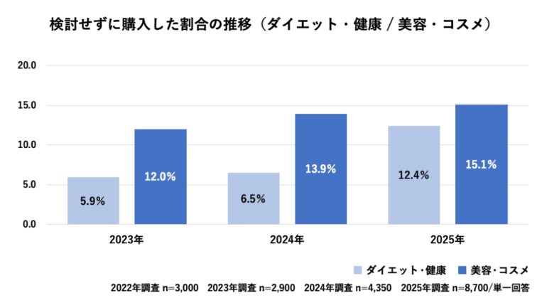 例えば、口コミの参照数が増加している一方で、生活者自身はこの行動を「検討せずに購入した」と認識する傾向が認められた。これは、生活者の情報収集が無意識化・ルーティン化されており、「検討」とは認識されにくくなっている可能性を示している。
