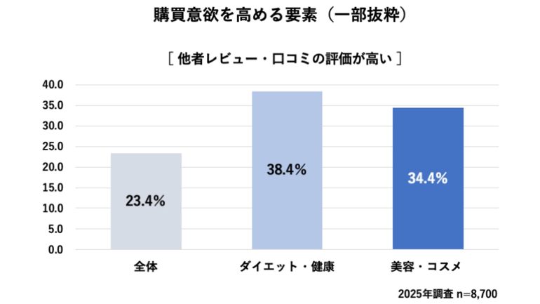 特に、ダイエット・健康および美容・コスメカテゴリーではこの傾向が高い結果となっているが(図7)、いずれも共通して他者レビューの結果が購入行動と結びついている傾向が見られる(図8)。