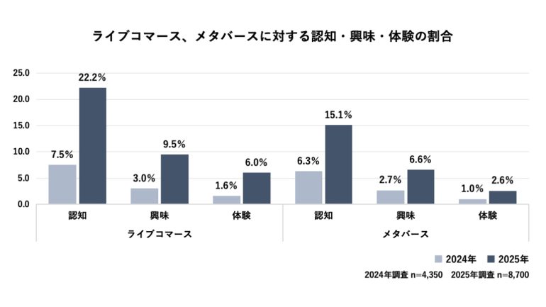 昨年と比較して、ライブコマースおよびメタバースにおける「認知・興味・体験」の割合が全体的に増加している。 特にライブコマースでは、各指標において前年比で大幅な伸びが見られ、より多くの生活者が関心を寄せていること考えられる。(図9)