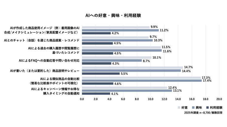AIサービスに対しても好意的な印象や興味を持つ生活者が一定数存在している。2025年5月の調査時点では利用経験は限定的な一方、興味はありながらも利用に踏み切れていない生活者がいることが明らかになっている。今後、サービスの認知度向上や体験機会の拡充により、利用が広がる余地が考えられる。(図10)