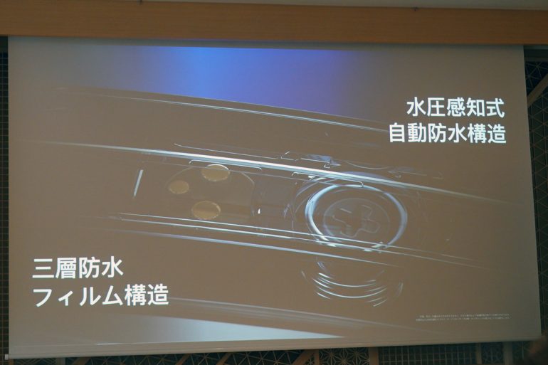 水圧感知式自動防水構造を搭載したことで、約30mの深度から自動的に圧力を感知して、自動で防水構造を強化する。