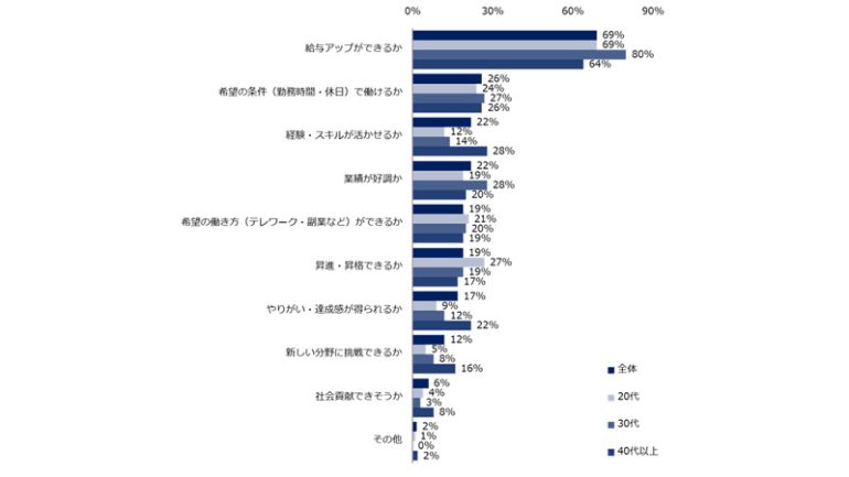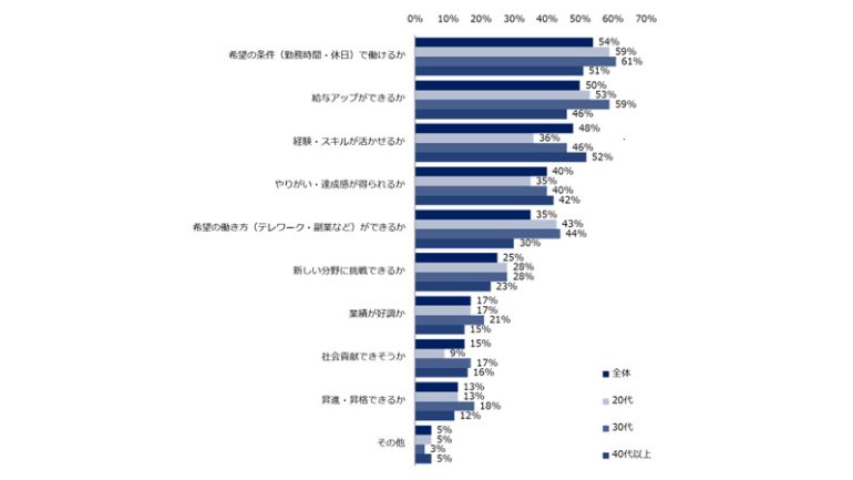 年代別で見ると、20代のみ上位3位に「希望の働き方(テレワーク・副業など)ができるか」(43%)がランクイン。