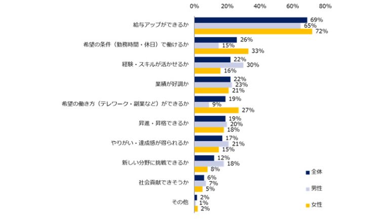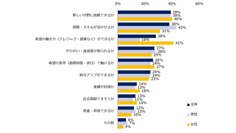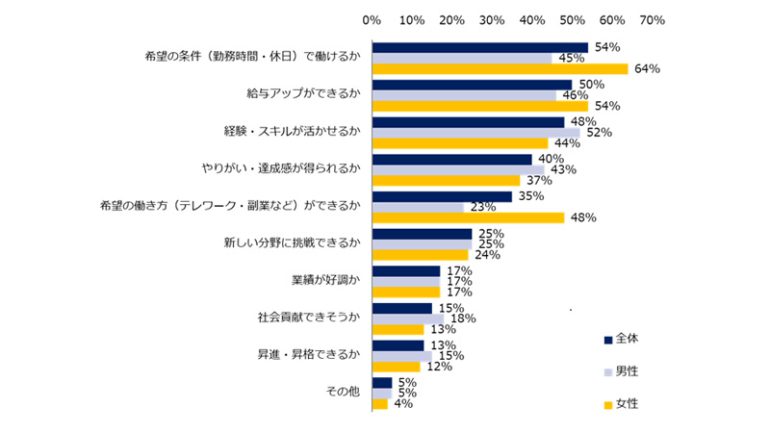 仕事選びの軸、男性は「経験・スキルが活かせるか」、女性は「希望の条件(勤務時間・休日)で働けるか」