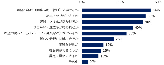 “仕事選びの軸”を質問すると、上位3位は「希望の条件(勤務時間・休日)で働けるか」(54%)、「給与アップができるか」(50%)、「経験・スキルが活かせるか」(48%)であった。