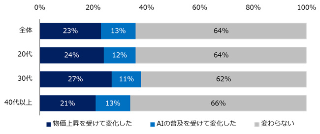 近年続く”物価上昇”や”AIの普及”をきっかけに、仕事選びを見直したかを質問したところ、「変わらない」が64%と半数を超えたが、23%と約4人に1人が「物価上昇を受けて変化した」と回答。また、13%が「AIの普及を受けて変化した」と回答した。