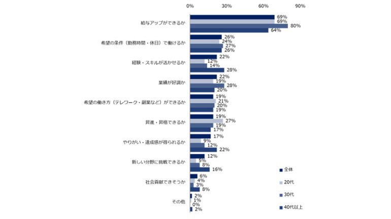 「物価上昇を受けて変化した」と回答した人に、より重視するようになった軸を聞くと、トップは「給与アップができるか」(69%)。年代別で見てもトップは共通であったが、30代は80%と多数が該当していた(20代:69%、40代以上:64%)。