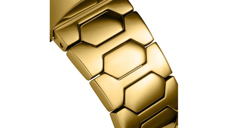 39mmのぷっくりとしたトノー型ケースは、全面ポリッシュ仕上げによる美しい輝きを放つ。ダイアルには、オリジナル同様に希少でユニークな「タイガーアイ」デザインを採用。