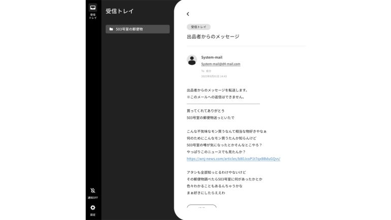 今回、日本テレビがタッグを組んだ第四境界の過去作品では、誰かの財布や交換日記、給与明細書といった、日常生活の中で当たり前に目にするものが、プレイヤーの手元に届くところから物語が展開してきた。『503号室の郵便物』でも、実際にプレイヤーの元へ郵送される郵便物から、物語が始まることとなる。