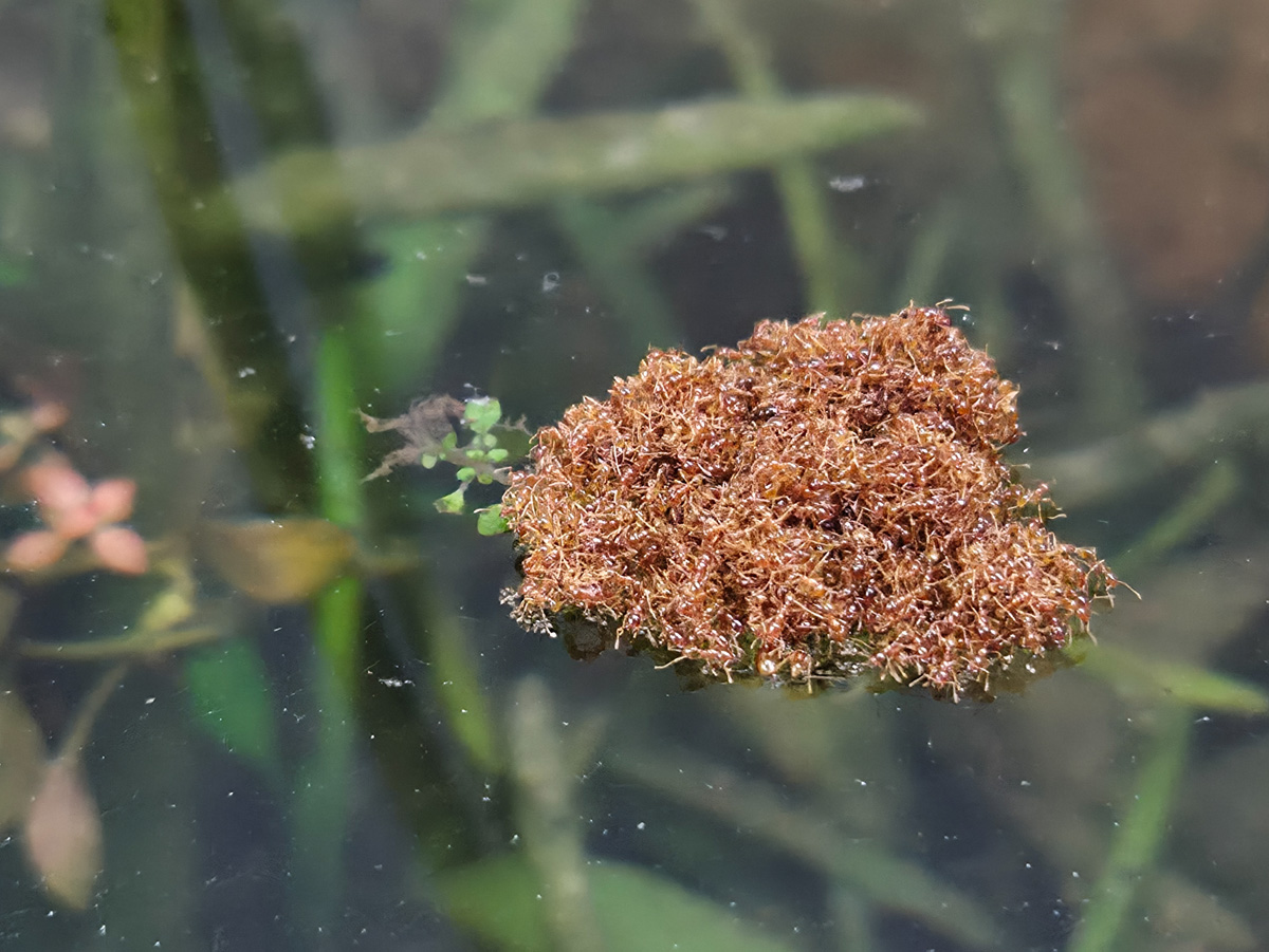 草むらなどの日当たりの良い場所を好んで巣を作り、大きなアリ塚を形成していきます。食性は雑食性で、植物の種子や蜜などから他の生き物までを餌とします。拡散能力は高く、水の上ではイカダを形成して移動することも知られています。
