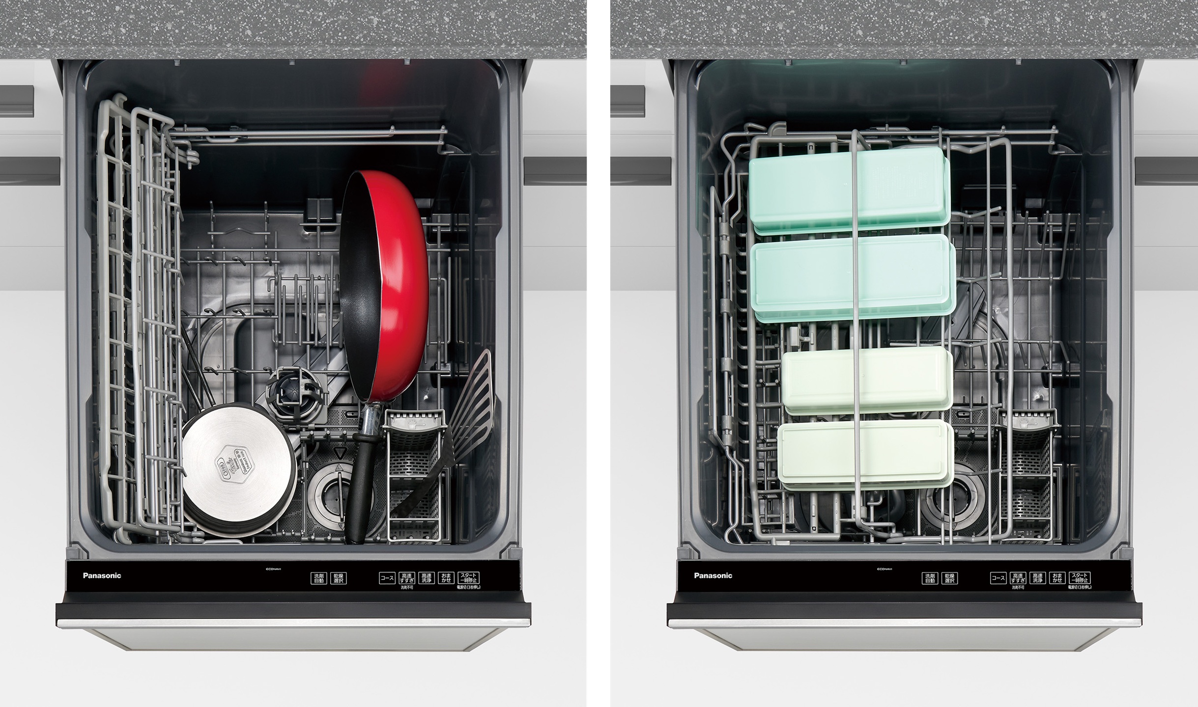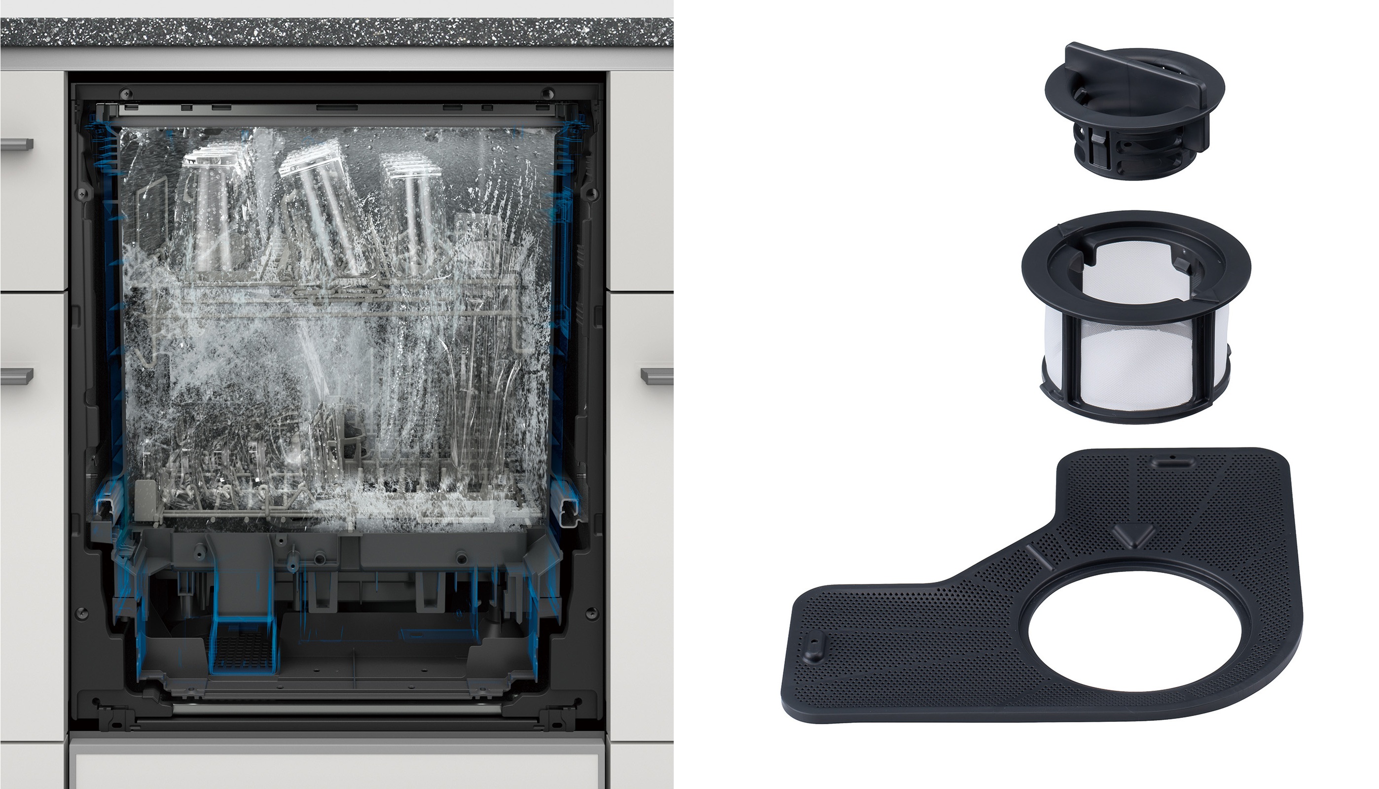 また、高温・高圧水流で汚れをしっかり洗い落とすため、面倒な予洗いは不要。さらに、残さいフィルターは3層構造を採用。細かい汚れも洗浄水からスピーディに分離し、排水ポンプで機外に排出するため、毎回のお手入れも不要だ。