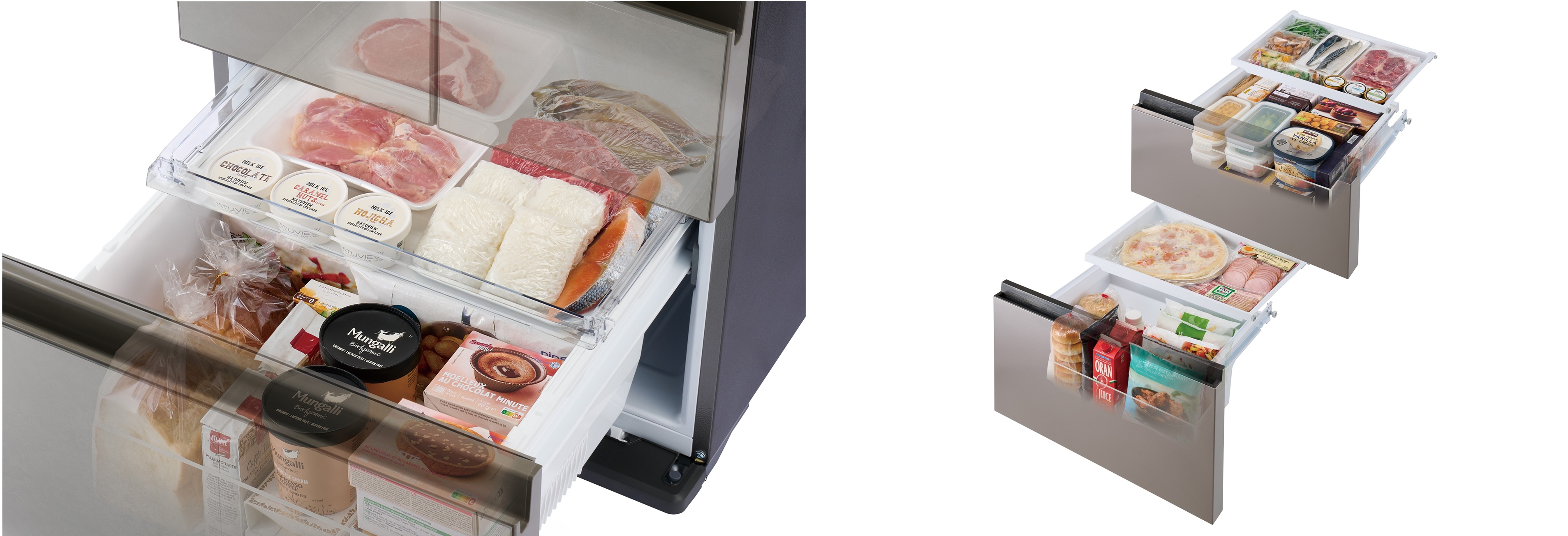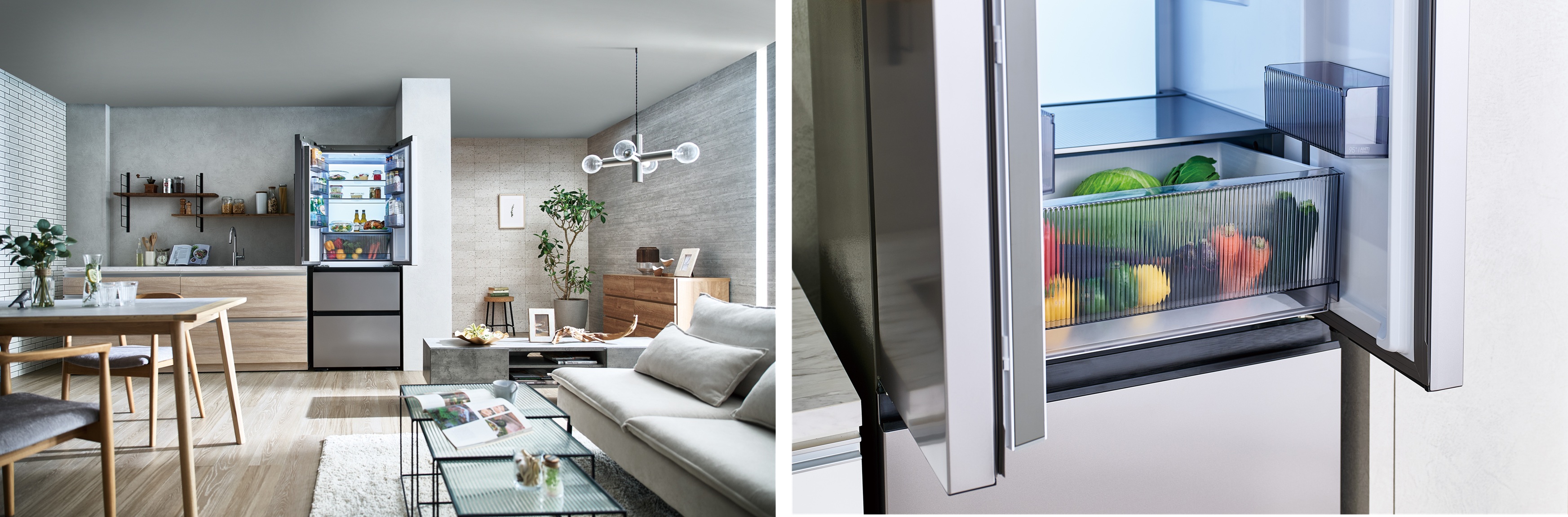 一方、「CŌRISM」は、冷蔵室にシンメトリーのフレンチドアを採用した4ドアタイプ。奥行59.4cmの薄型デザインで、冷蔵室の扉は90°開くとバスケットが引き出せる壁際フィット構造となっている。