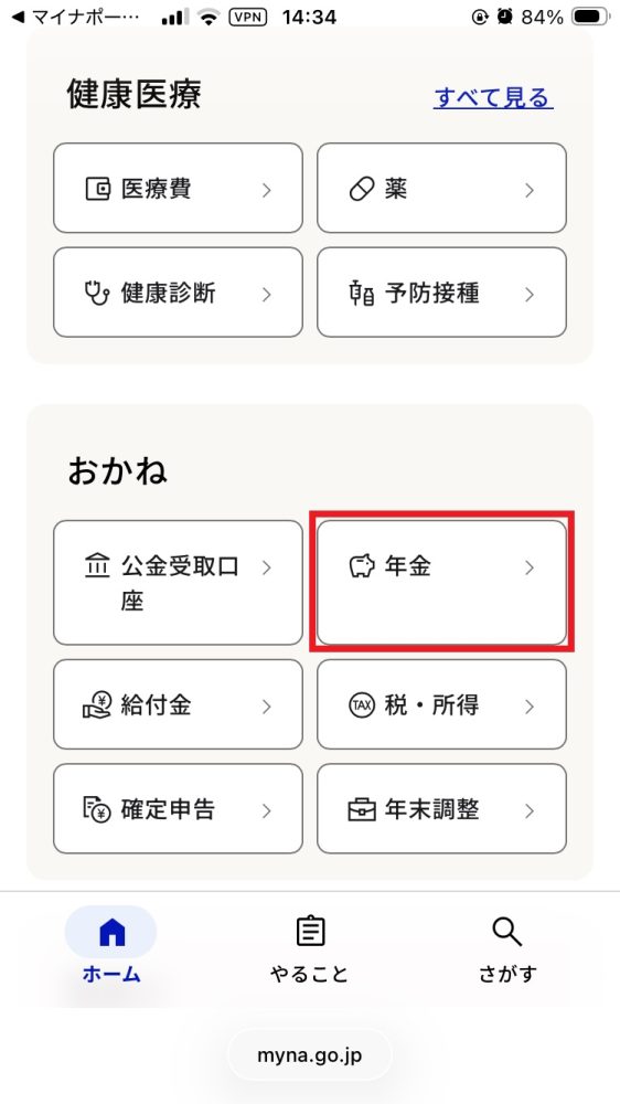 マイナポータルのトップページで「年金」ボタンをタップ(パソコンの場合はクリック)