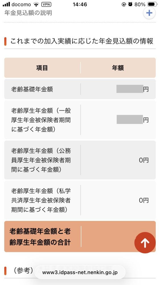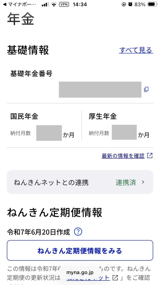 マイナポータル経由でねんきんネットにアクセスすると、以下のような年金情報を確認できる。