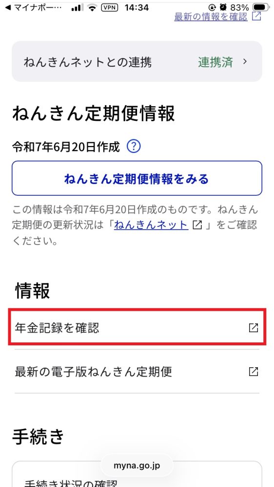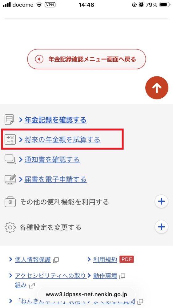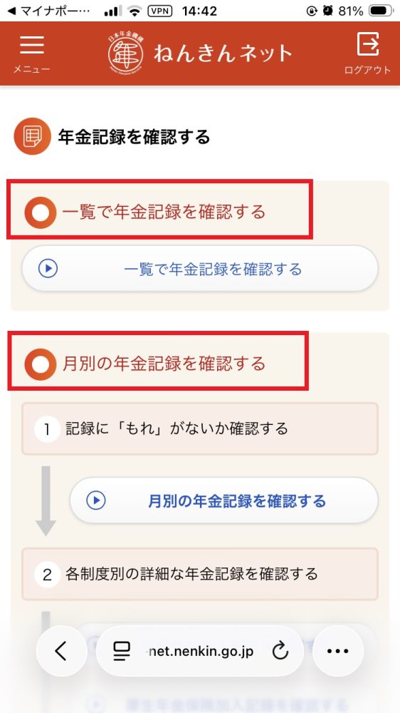 ②「年金記録を確認」をタップすると「ねんきんネット」につながる