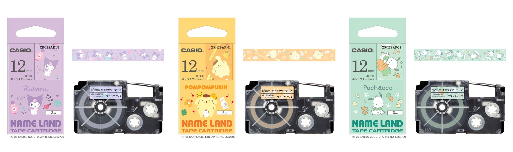 このほか、「サンリオ」の6キャラクター「ハローキティ」、「シナモロール」「マイメロディ」、「クロミ」、「ポムポムプリン」、「ポチャッコ」のネームランドテープ「XR-12SA」(6種)も同時発売。いずれも12mm幅のテープを採用し、ネームランドの全モデルで使用可能だ。価格はオープンで、公式オンラインストアでの販売価格は各880円。