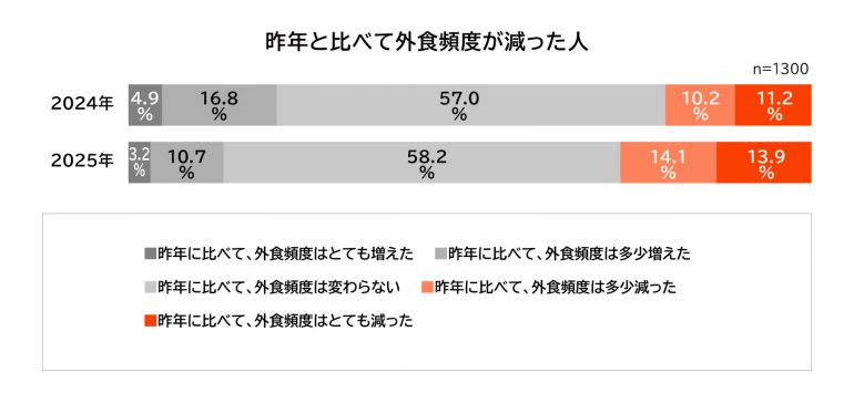 外食する頻度が昨年より減少した人(「昨年に比べて、外食頻度は多少減った」「昨年に比べて、外食頻度はとても減った」の合計)は21.3%。2024年から6.7ポイント増加した(21.3%→28.0%)。【図表5】