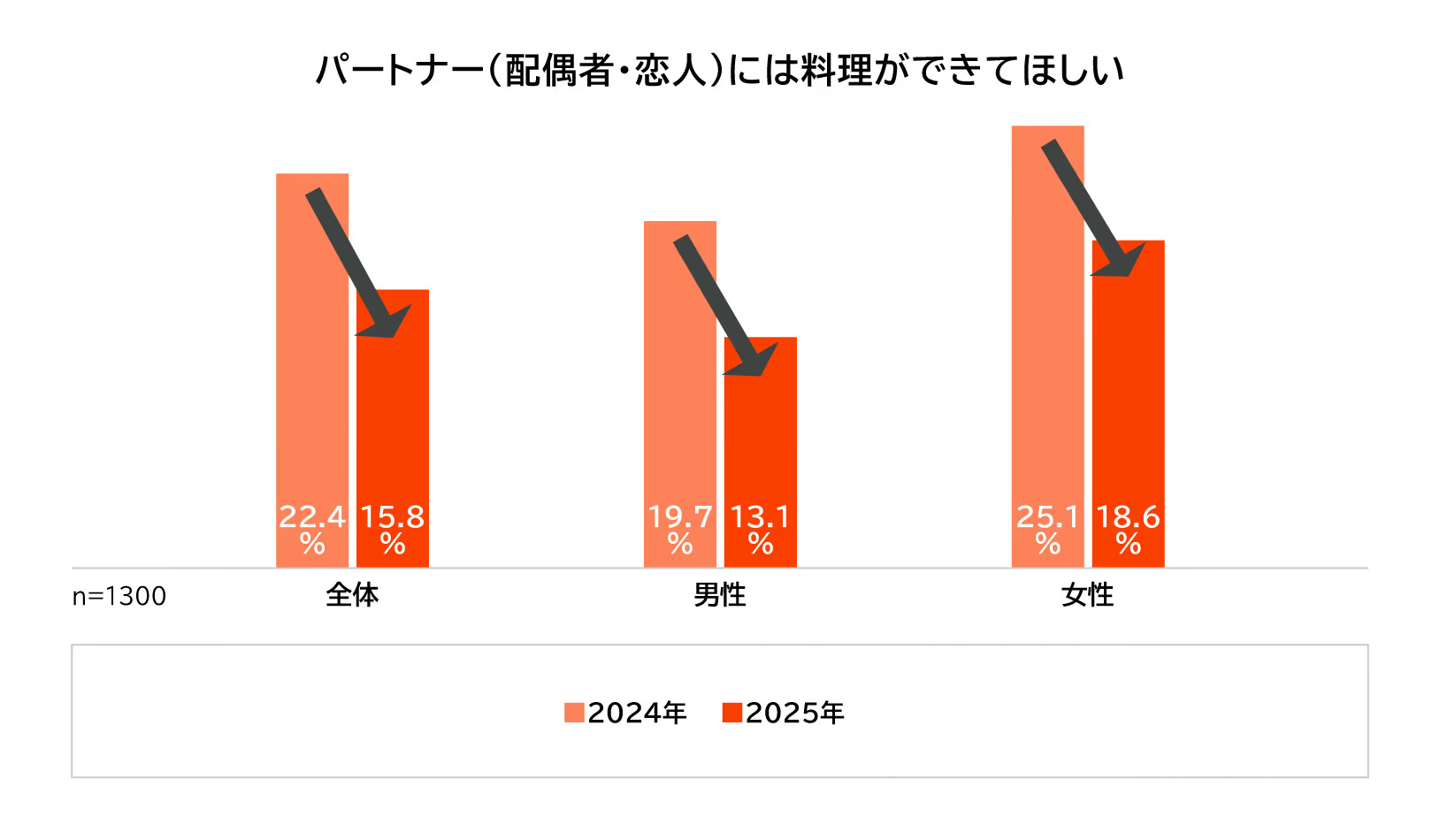 「パートナーには料理ができてほしい」と考える人は、昨年比で3割減少