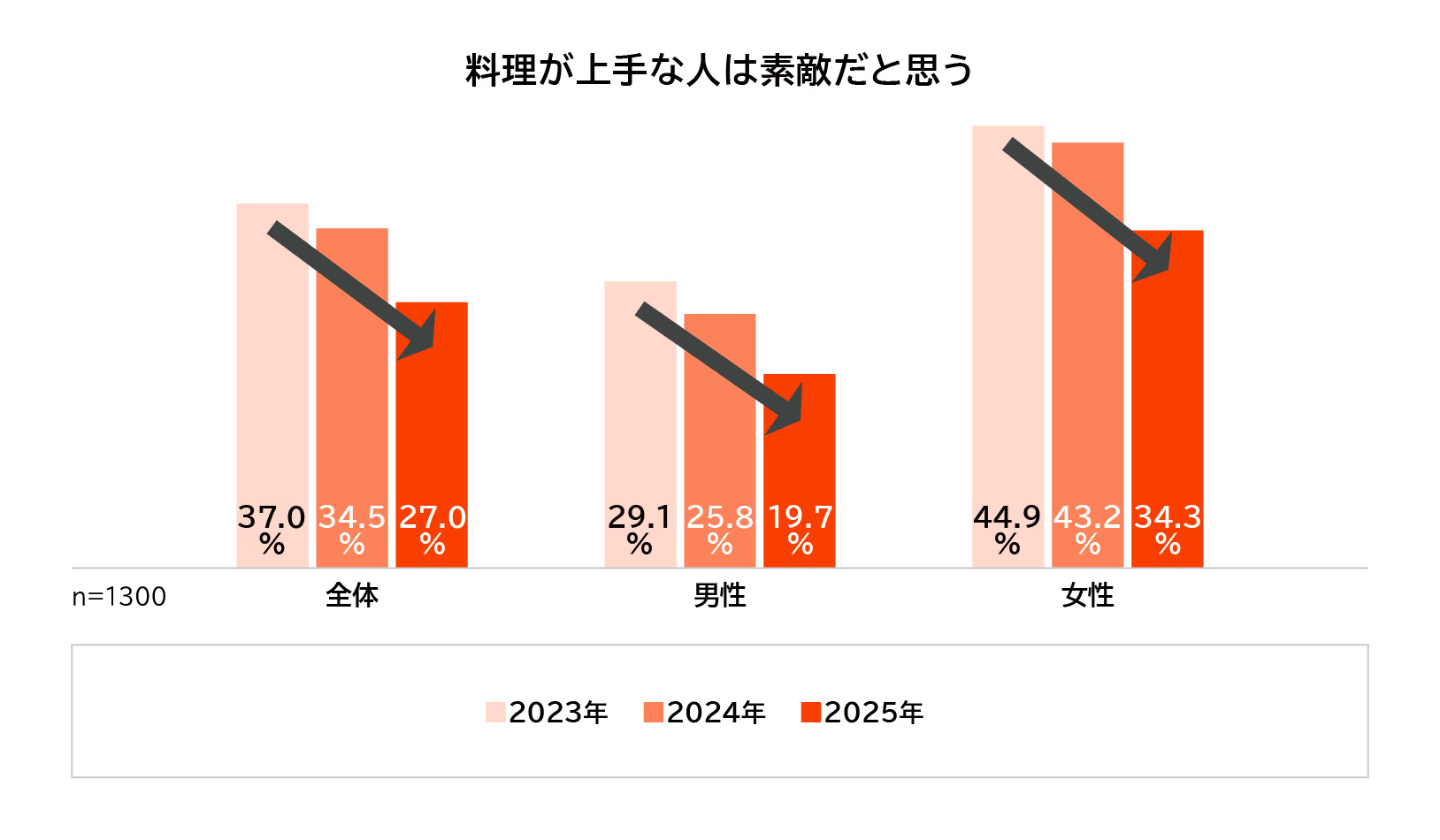 「料理が上手な人は素敵だと思う」人は、全体で27.0%。2年前(2023年)と比べて、男女ともに約10ポイント減少した(男性29.1%→19.7%、女性44.9%→34.3%)。【図表2】