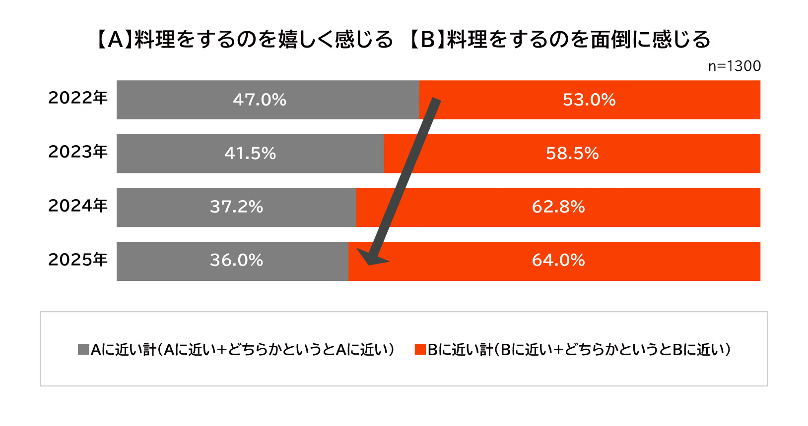 料理をするのを面倒に感じる人(「B(料理をするのを面倒に感じる)に近い」「どちらかというとBに近い」の合計)は64.0%。2022年(53.0%)、2023年(58.5%)、2024年(62.8%)と、直近4年間で増加傾向となった。【図表3】