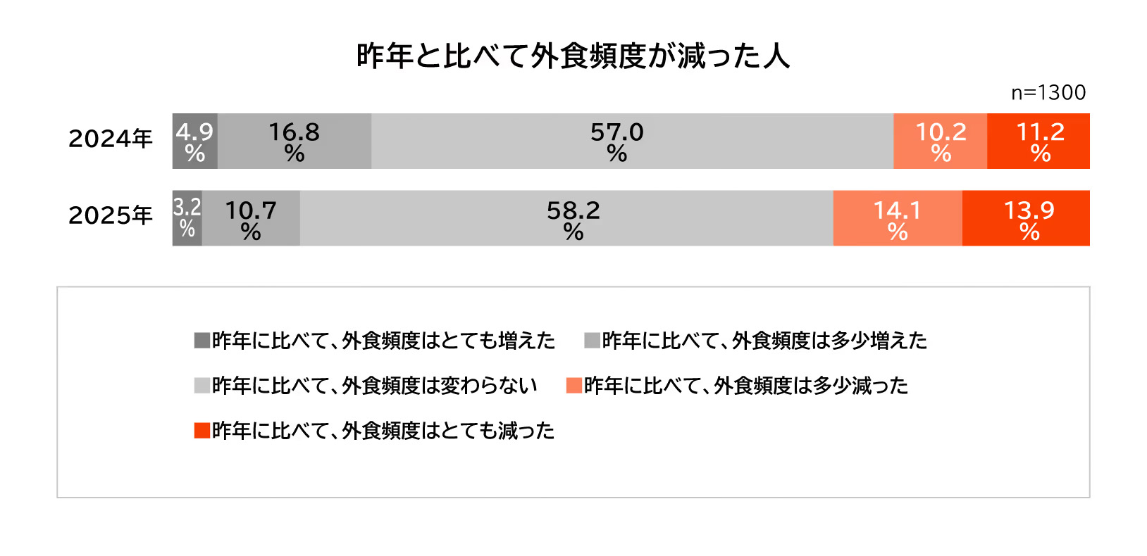 外食する頻度が昨年より減少した人(「昨年に比べて、外食頻度は多少減った」「昨年に比べて、外食頻度はとても減った」の合計)は21.3%。2024年から6.7ポイント増加した(21.3%→28.0%)。【図表5】