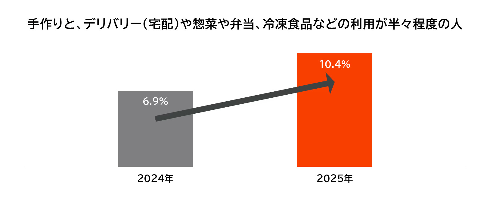 「手作りと、デリバリー(宅配)や惣菜や弁当、冷凍食品などの利用が半々程度」の人は、10.4%。2024年から3.5ポイント増加した(6.9%→10.4%)。【図表7】